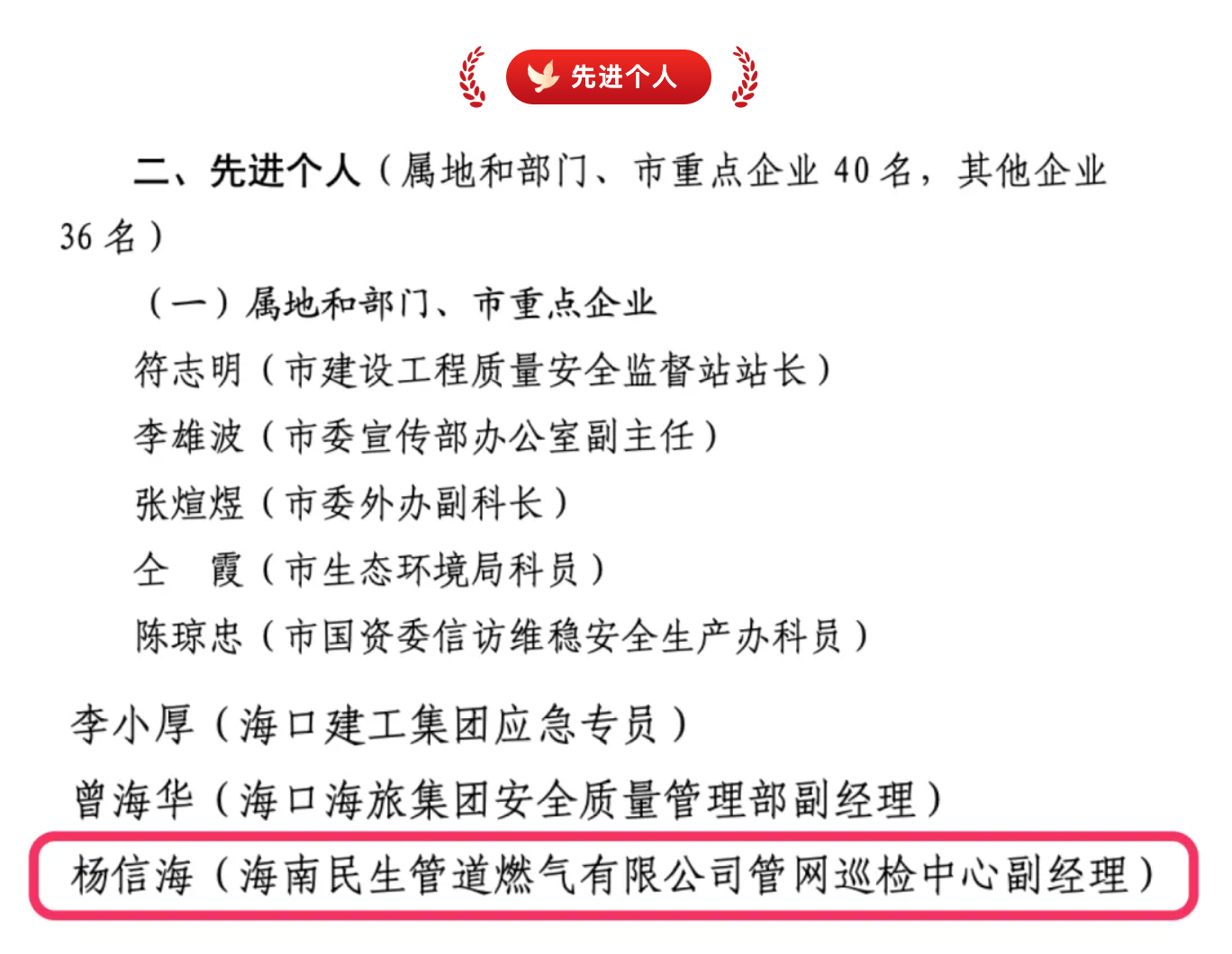 近日,海口市防災減災消防和安全生產委員會印發《關于 2024 年度安全生產先進單位和個人的通報》(海防安委【2025】2號),海南民生管道燃氣有限公司獲評“2024年度安全生產先進單位”,公司管網巡檢中心副經理楊信海榮獲“安全生產先進個人”稱號。